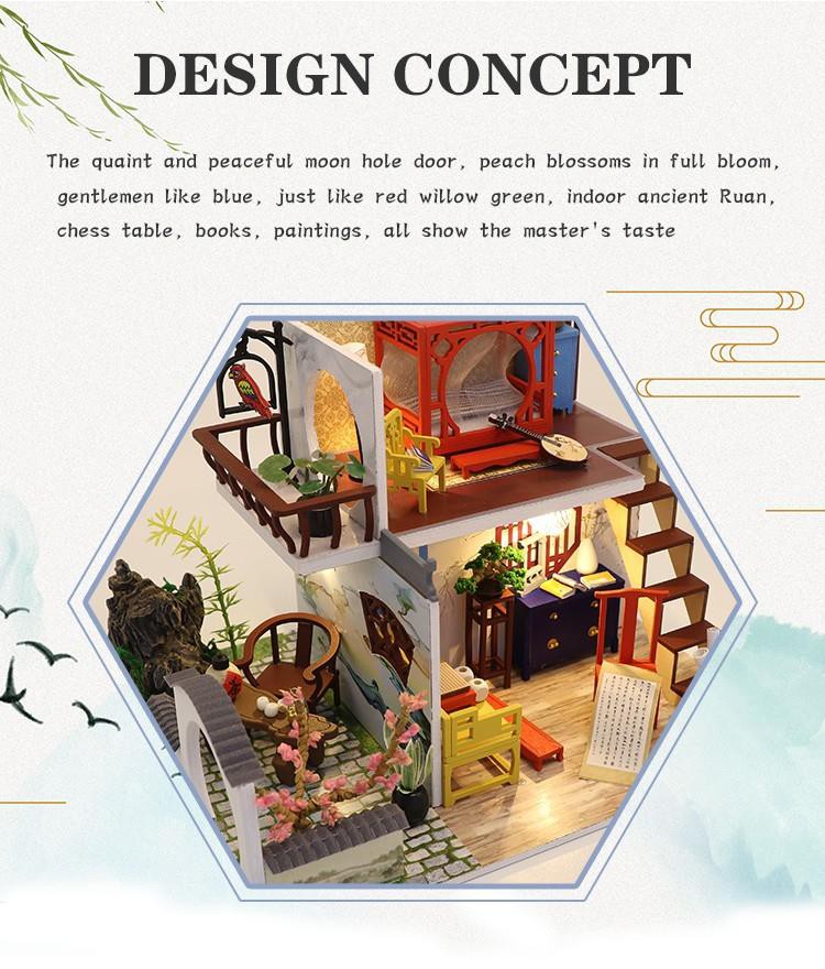 Idea for design :Classical Chinese style design, quaint and tranquil moon hole door, peach blossoms in full bloom, gentlemen like blue, red flowers and green willows, indoor ancient Ruan, chess table, books, paintings, all show the taste of the master, the red curtain upstairs upstairs, a blind dream It is 'the thrush in front of the Linghua Mirror, and the red gauze tent is warm and lying down', which brings you back to your past life and relives the love of the world.